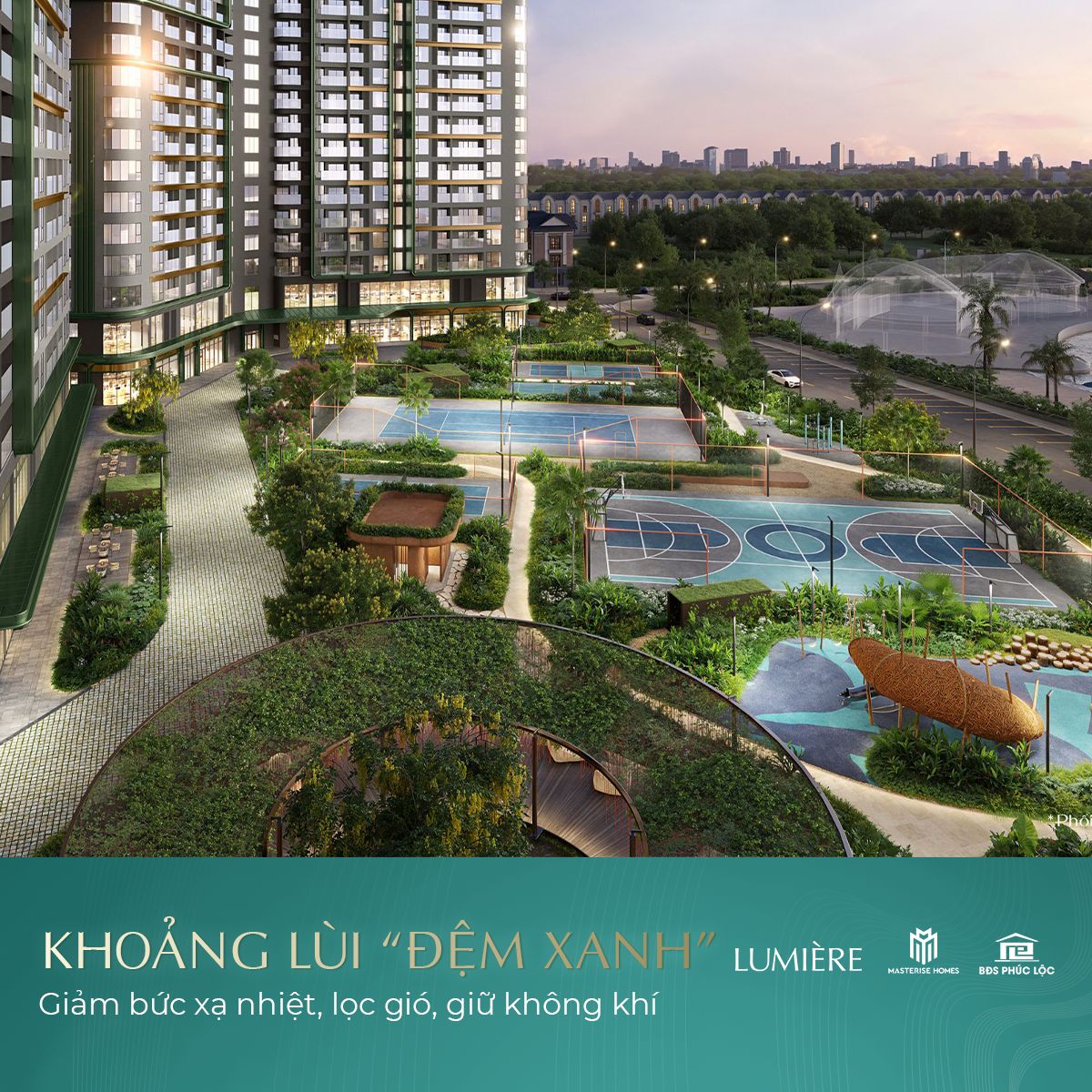 Một trong những chi tiết đặc biệt trong thiết kế của Lumière Bayfront chính là khoảng lùi cảnh quan “đệm xanh”. Không chỉ đơn thuần mang yếu tố thẩm mỹ, “đệm xanh” còn được quy hoạch thông minh để giảm bức xạ nhiệt, lọc gió và duy trì không khí trong lành quanh năm. Nhờ đó, mỗi căn hộ không chỉ được bảo vệ khỏi tác động khắc nghiệt của thời tiết, mà còn thừa hưởng một môi trường sống cân bằng, mát lành – như được bao bọc bởi một “lá phổi tự nhiên” ngay giữa lòng dự án.
