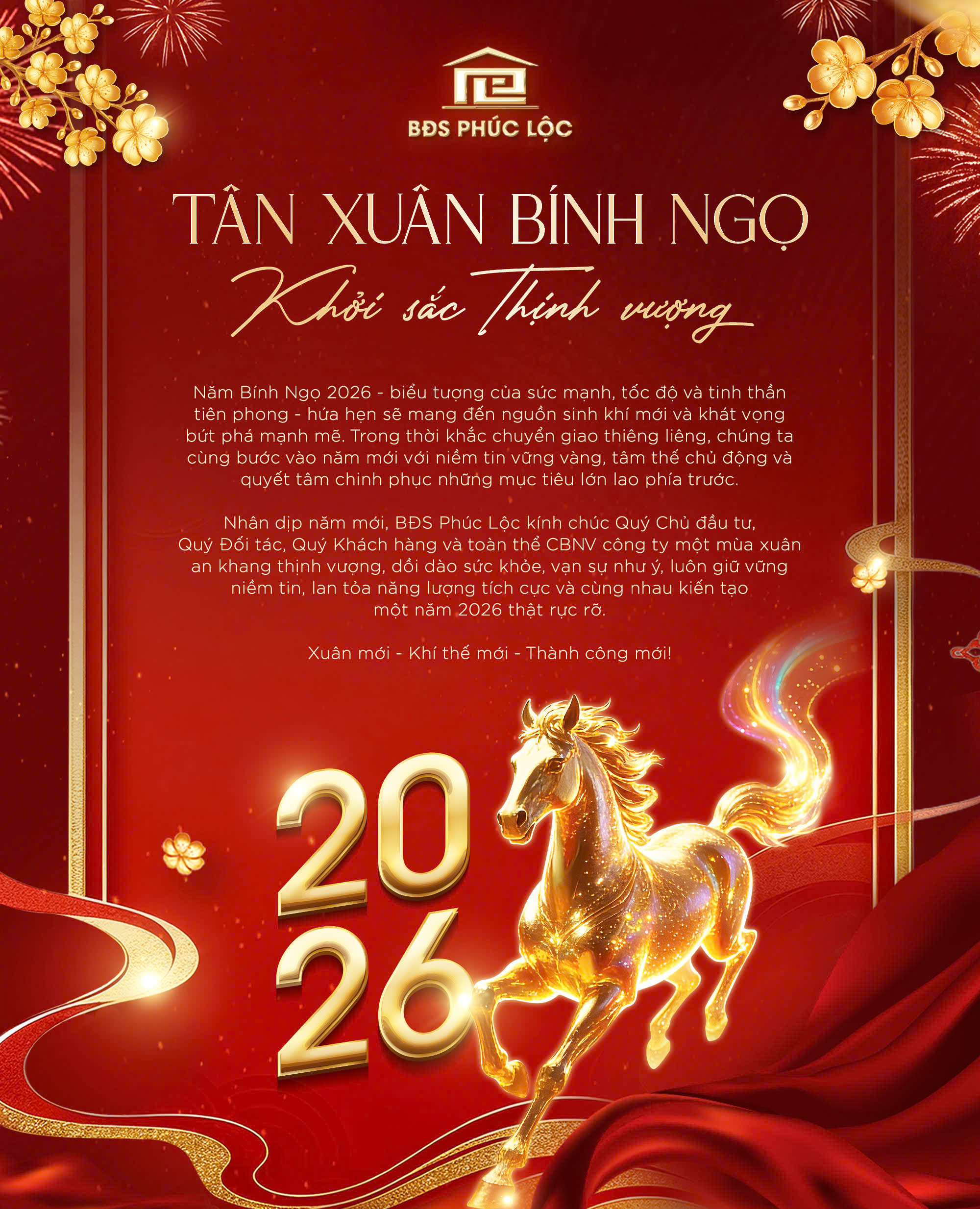 Nhân dịp năm mới, BĐS Phúc Lộc kính chúc toàn thể CBNV công ty một mùa xuân an khang thịnh vượng, dồi dào sức khỏe, vạn sự như ý, luôn giữ vững niềm tin, lan tỏa năng lượng tích cực và cùng nhau kiến tạo một năm 2026 thật rực rỡ.