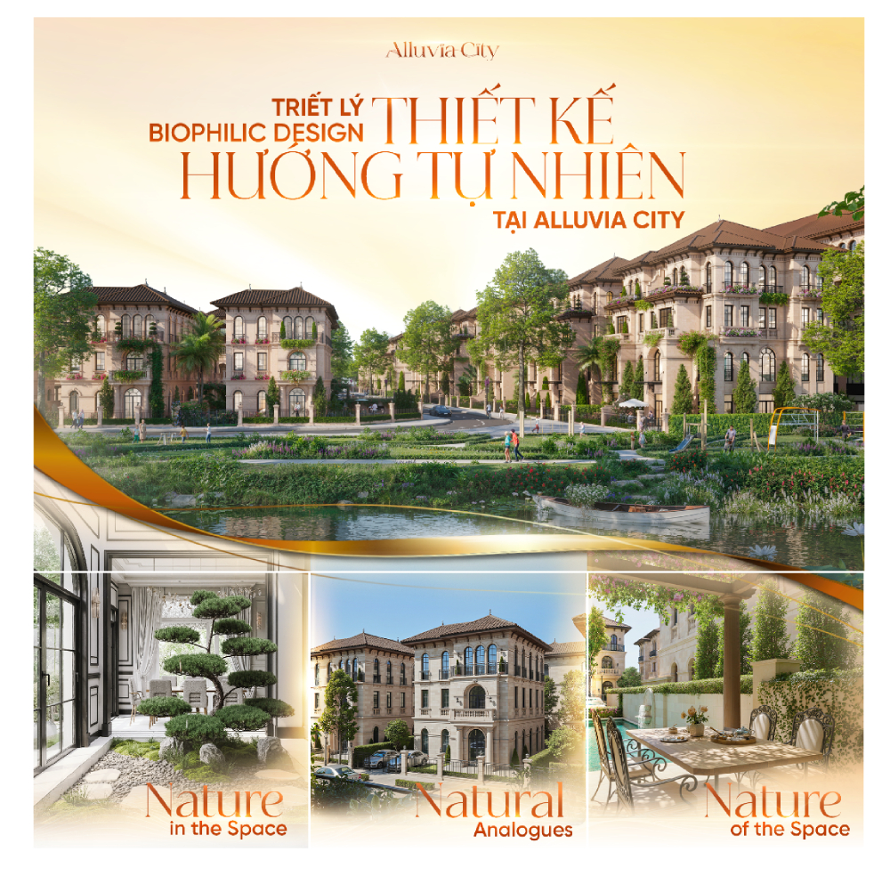 Tại Việt Nam, Alluvia City được xem như một trong những dự án tiên phong mang triết lý này vào đời sống cư dân đô thị. Không chỉ dừng lại ở cảnh quan, “thiết kế hướng tự nhiên” của Alluvia City được ứng dụng toàn diện từ quy hoạch tổng thể đến từng chi tiết kiến trúc, vật liệu và trải nghiệm sống hàng ngày.